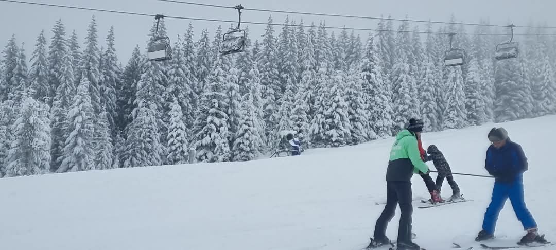 Pe pârtia din centrul stațiunii turiștii au ieșit la sanie și chiar la schi. Este pornit telescaunul și continuă să ningă. Astfel, vor fi condiții și mai bune pentru practicarea sporturilor de iarnă.
