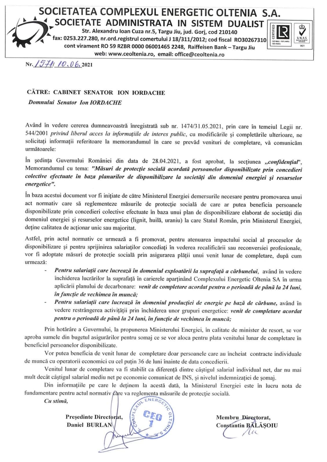 Senatorul de Gorj al PNL, Ion Iordache, a cerut date cu privire la aşa-zisul pachet de siguranţă pregătit de Ministerul Energiei pentru disponibilizaţii de la CEO, CEH şi CNU. Acesta a observat că există o discriminare între cei care vor fi concediaţi din companiile statului menţionate şi a transmis un comunicat de presă pe această temă. Practic, parlamentarul este nemulţumit de colegii săi de partid din Ministerul Energiei.