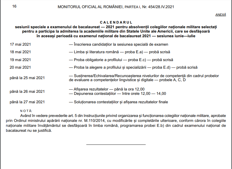 În Monitorul Oficial a fost publicat ieri un Ordin al ministrului educației privind aprobarea calendarului sesiunii speciale a examenului de bacalaureat — 2021 pentru absolvenții colegiilor naționale militare selectați pentru a participa la admiterea la academiile militare din Statele Unite ale Americii, care se desfășoară în aceeași perioadă cu examenul național de bacalaureat 2021 — sesiunea iunie—iulie. Această sesiune se va desfășura în cursul lunii mai, conform…