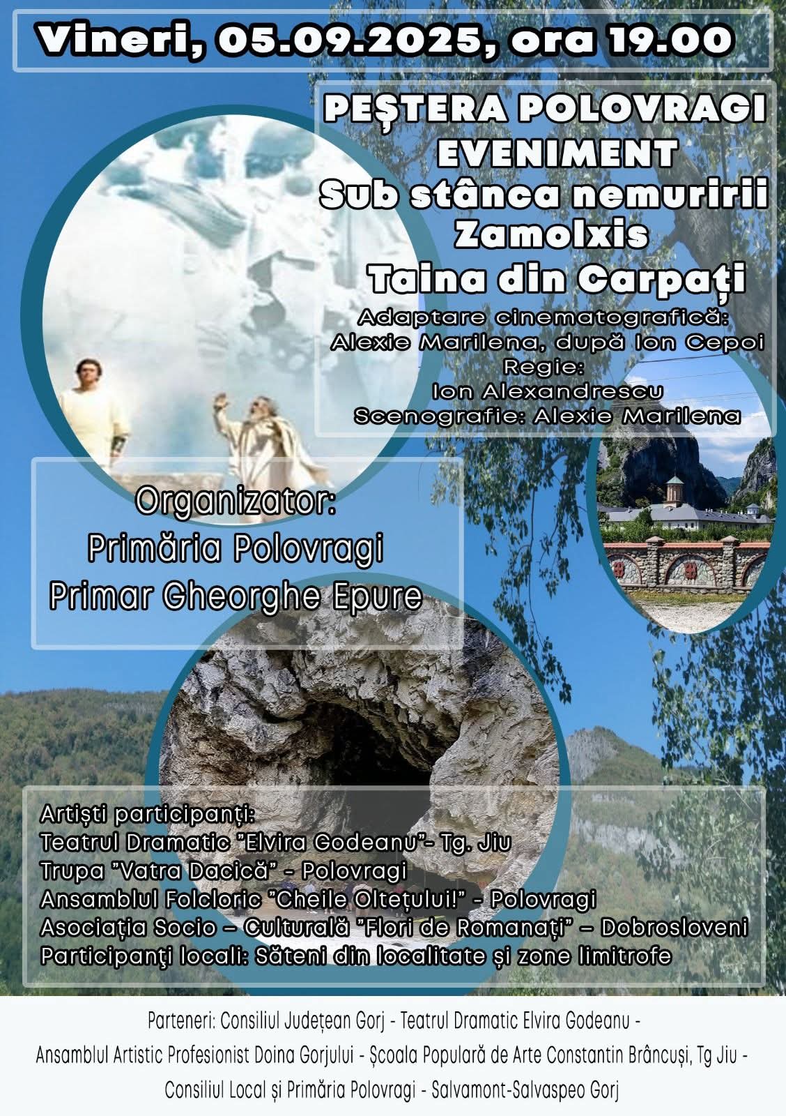 ”Vă invităm alături de noi la un eveniment inedit, ”Sub stânca nemuririi- Zamolxis: Taina din Carpați”, un spectacol care își dorește să readucă în atenție miturile și valorile strămoșești, într-o punere în scenă emoționantă și plină de mister, inspirată de legenda lui Zamolxis și de taina ce sălășluiește în Munții Carpați” transmite Consiliul Județean Gorj.