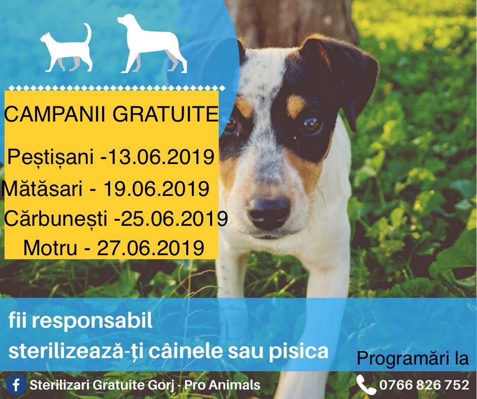 Asociația Pro Animals Gorj continuă campaniile de sterilizări gratuite pentru câini și pisici, în localitățile județului nostru. În această perioadă, asociația organizează noi sesiuni de sterilizări pentru patrupede astfel: Peștișani – 13 iunie, Mătăsari – 19 iunie, Târgu-Cărbunești – 25 iunie, Motru – 27 iunie.