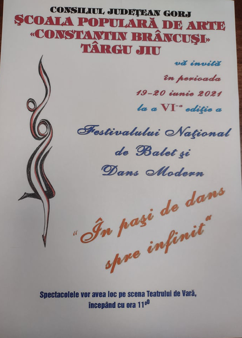 În jur de 300 de copii din mai multe județe ale țării sunt așteptați în acest weekend la Târgu-Jiu, unde se va desfășura cea de-a VI-a ediție a Festivalului Național de Balet și Dans Modern ,,În pași de dans spre infinit”. Concursul se va desfășura pe parcursul a două zile, la Teatrul de Vară și la Teatrul Dramatic ,,Elvira Godeanu” din Târgu-Jiu.
