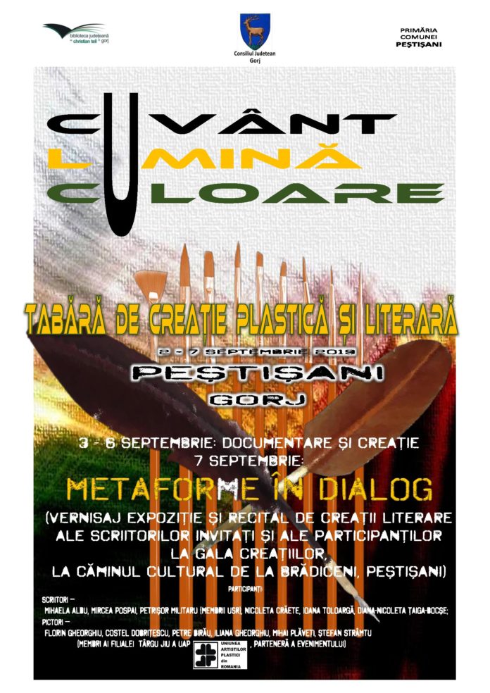 Tabăra de creaţie plastică şi literară „Cuvânt, lumină şi culoare“ va avea loc în perioada 2 – 7 septembrie, în comuna lui Brâncuşi, Peștișani. „Proiectul cultural are ca scop contribuția la valorificarea patrimoniului cultural creativ local și județean gorjean prin: dezvoltarea de forme inovative de promovare a patrimoniului cultural gorjean pe baza dialogului dintre literatură și arte; stimularea creativilor (scriitori, artiști etc) prin expunerea la patrimoniul cultural local; susținerea dezvoltării de produse culturale care să contribuie la promovarea turistică a județului.