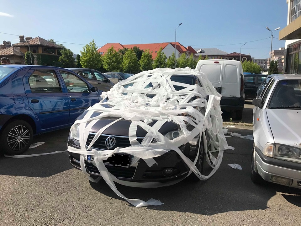 Mașinile învelite în hârtie igienică au devenit o adevărată ”artă” în municipiul Târgu Jiu. În această dimineață, un târgujian a fotografiat un alt autoturism îmbrăcat cu hârtie igienică pe strada Popa Șapcă. Trecătorii s-au amuzat când au văzut ”opera de artă”. Menționăm că nu este primul caz de acest gen din Târgu Jiu.