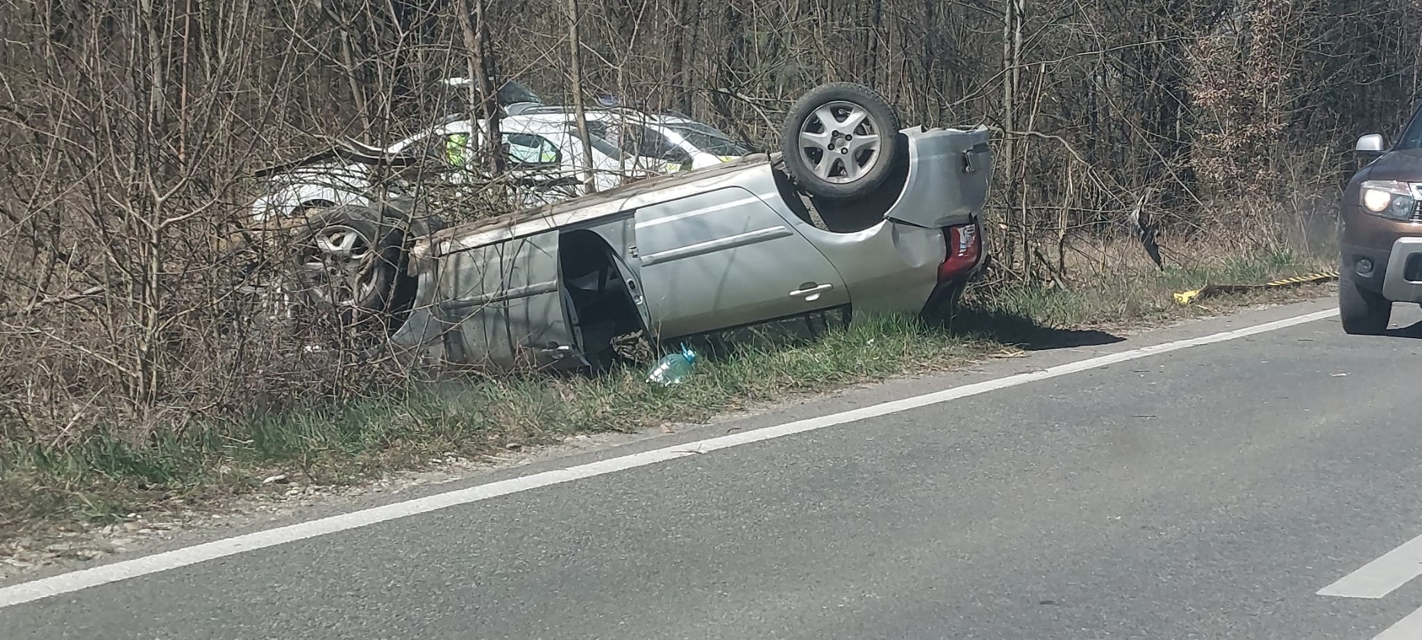 Conducătorul auto a pierdut controlul volanului și s-a răsturnat cu mașina în afara drumului național. Poliția Rutieră a deschis un dosar penal pentru comiterea infracțiunii de vătămare corporală din culpă.