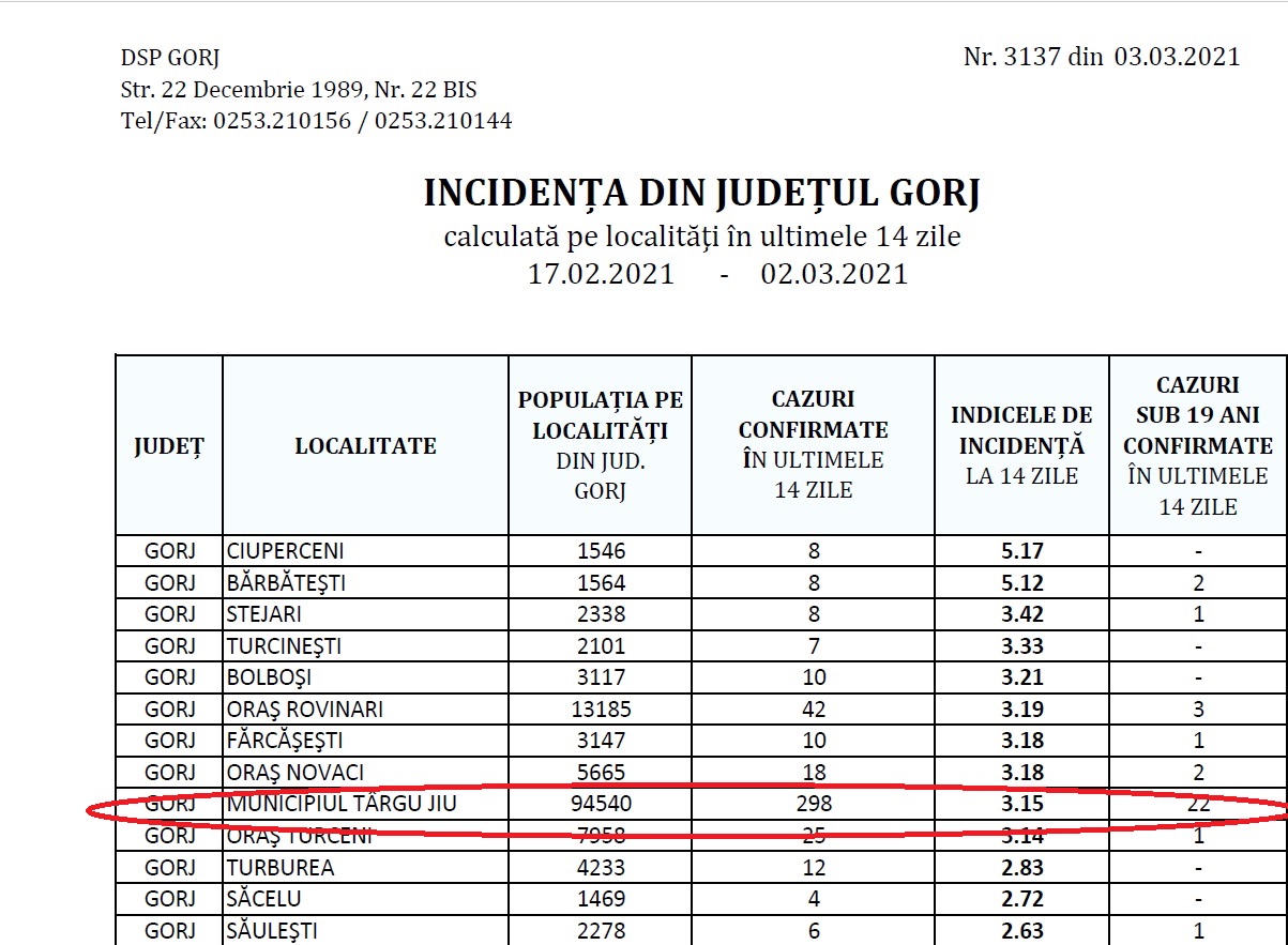 Municipiul Târgu-Jiu a intrat în scenariul roșu, rata de infectare cu coronavirus ajungând la 3,15 la mia de locuitori.