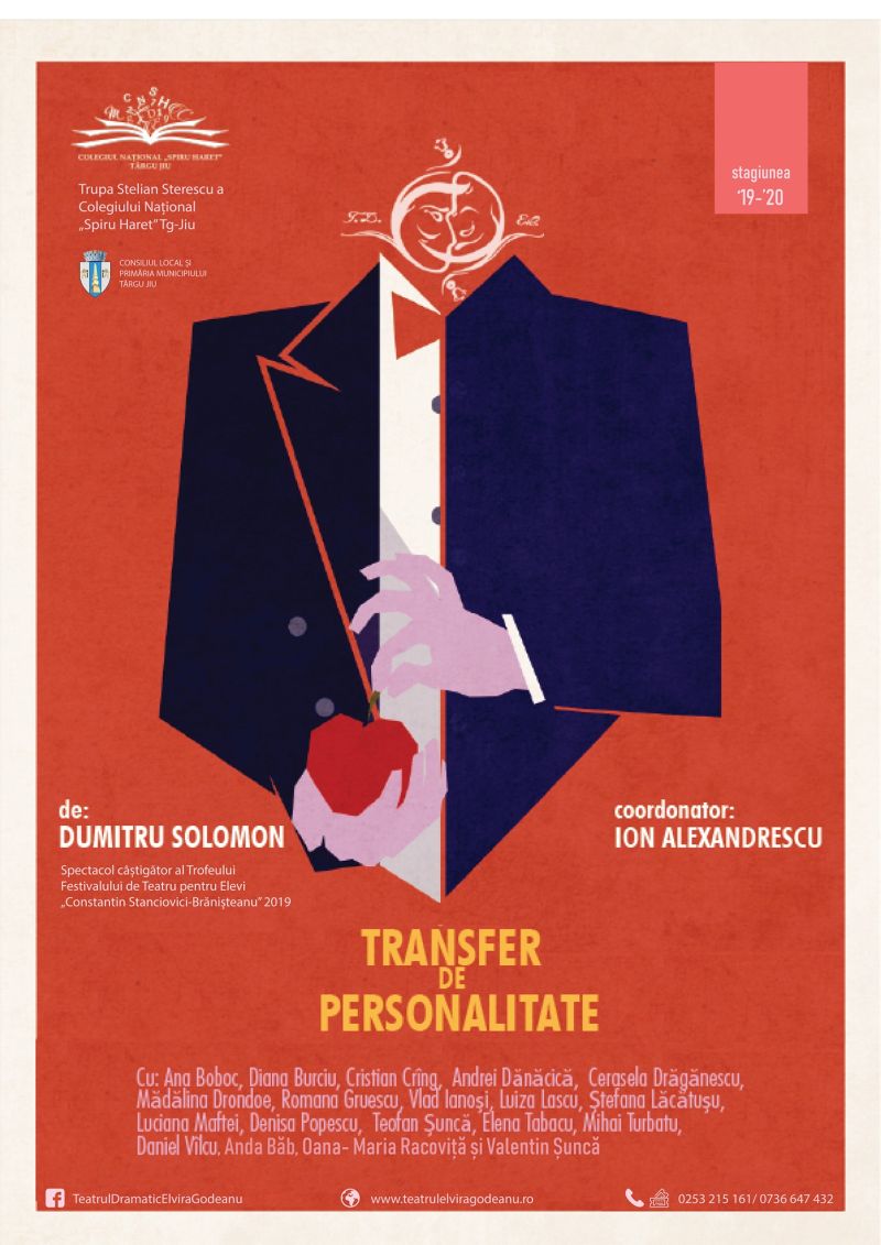 Sâmbătă, 29 februarie, de la ora 19.00, pe scena Teatrului Dramatic „Elvira Godeanu” din Târgu-Jiu, se va juca spectacolul „Transfer de personalitate”, câștigător al Trofeului Festivalului de Teatru pentru Elevi „Constantin Stanciovici-Brănișteanu” 2019. Distribuție: Josef Pavlicek – Vlad Ianoși; Comisarul – Andrei Dănăcică; Judecătorul – Teofan Șuncă; Judecătorul de instrucție – Daniel Vîlcu / Valentin Șuncă; Cetlicka – Cristian Crîng; Logodnica…