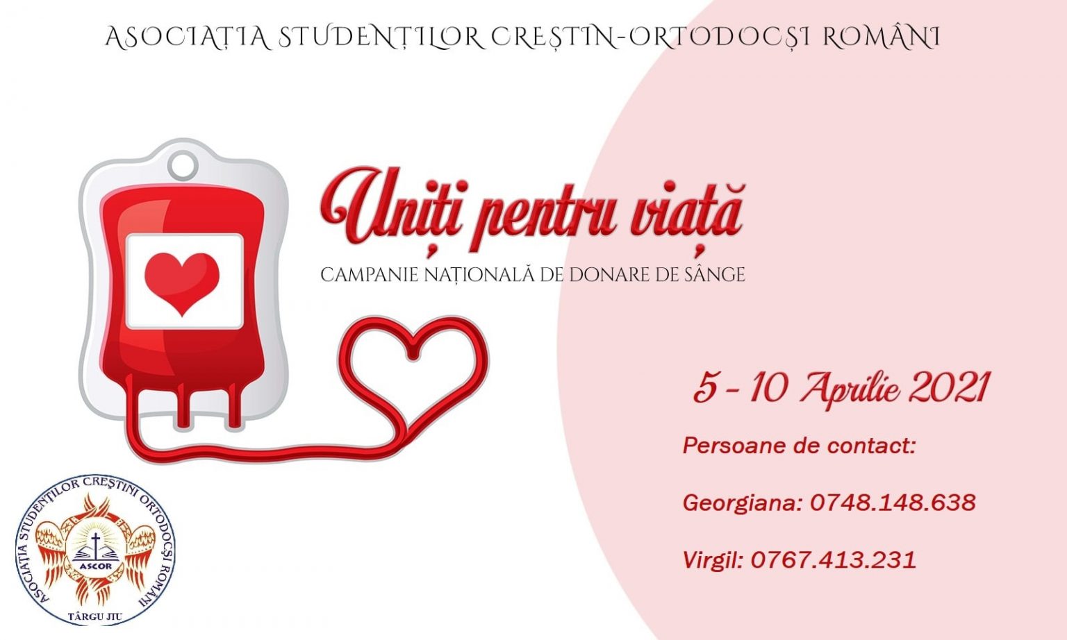 Asociaţia Studenţilor Creştin-Ortodocşi Români (A.S.C.O.R.), filiala Târgu Jiu, organizează vineri, 9 aprilie, o acţiune de donare de sânge în cadrul Campaniei „Uniţi pentru Viaţă”. Acţiunea se desfăşoară cu binecuvântarea Înaltpreasfinţitului Părinte Irineu, Arhiepiscopul Craiovei şi Mitropolitul Olteniei, şi va avea loc începând cu ora 9.00, la Centrul de Transfuzie Sanguină Târgu Jiu (str. 22 Decembrie 1989, nr. 28). Toți cei care doresc să-i ajute pe cei…