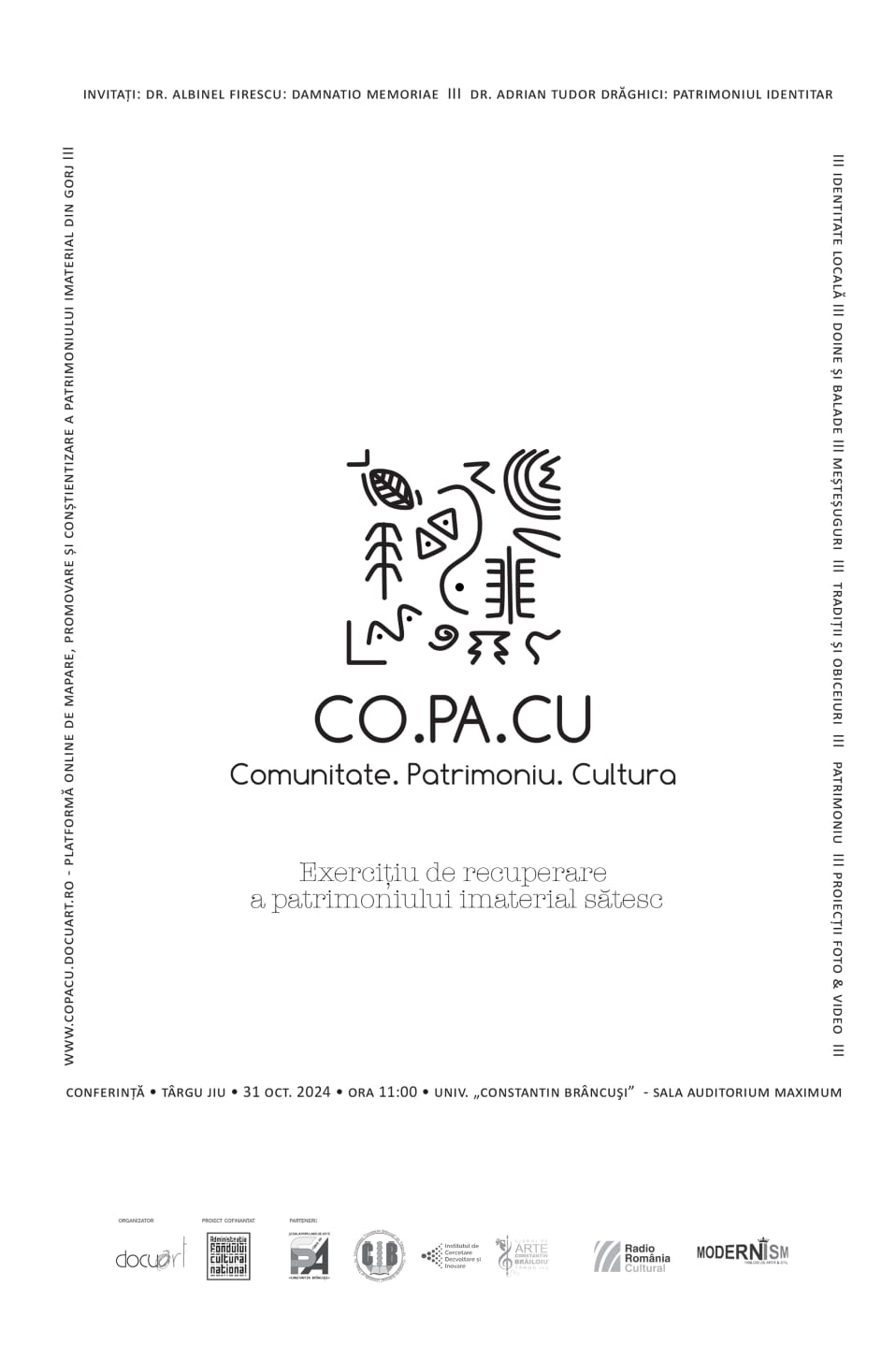 Universitatea „Constantin Brâncuși” din Târgu Jiu – în calitate de parteneră a Asociației Docuart – are plăcerea de a invita publicul larg, autoritățile locale, membrii comunității și specialiștii din domeniul cultural la un eveniment special dedicat conservării patrimoniului cultural gorjean.