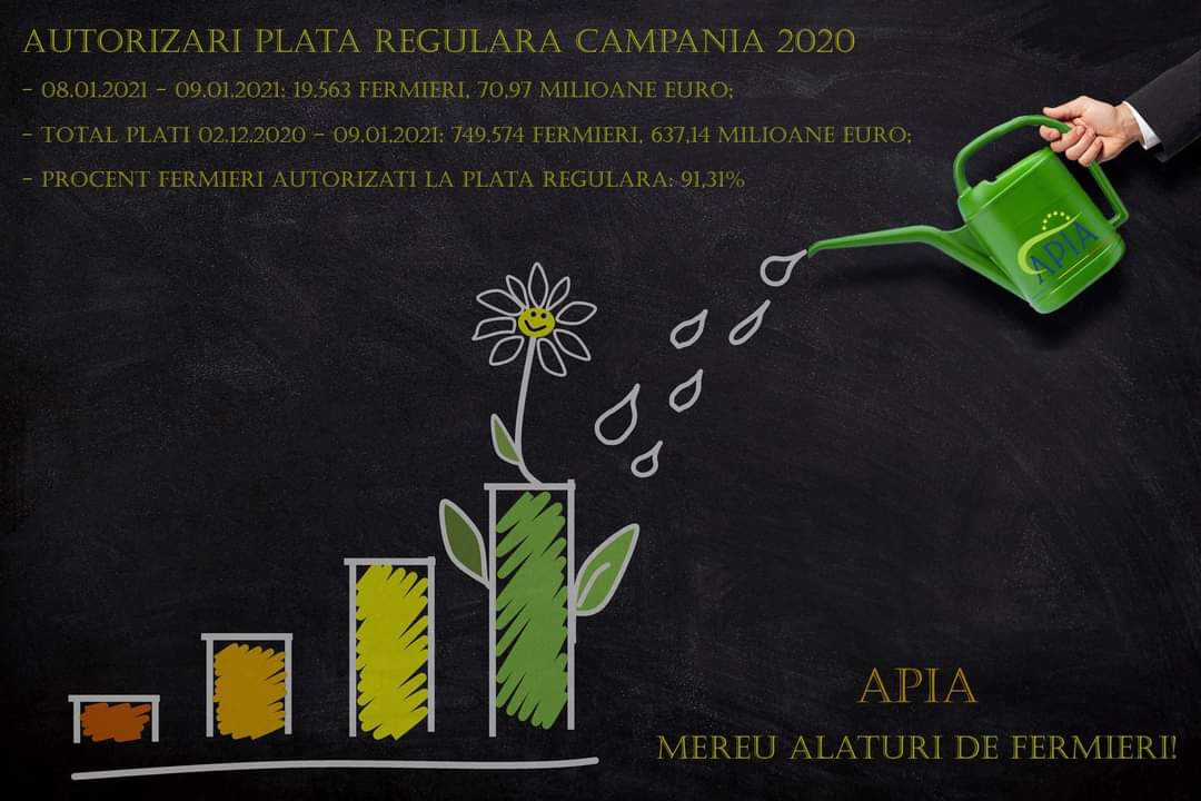 În perioada 08.01.2021 – 09.01.2021 APIA a autorizat la plată un număr de 19.563 fermieri pentru o sumă totală de 70,97 milioane de euro, din care 38 milioane euro reprezintă plăți pentru Sprijinul cuplat în sectorul zootehnic.