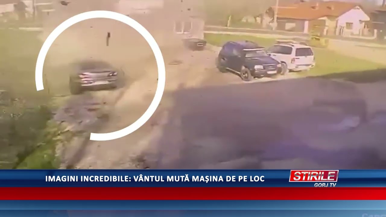 Imagini incredibile surprinse de o cameră de supraveghere, joi, în comuna Bâlta, din județul Gorj arată cum vântul a suflat atâț de tare încât a mutat din loc o mașină, potrivit ziare.com.