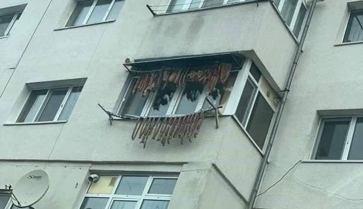 Două fotografii postate pe Facebook în care apar slănină și cârnați puși la uscat pe sârmă în afara balconului în Rovinari, județul Gorj, au devenit virale, arată Hotnews. ”Meanwhile in Rovinari…leagănul civilizației moderne”, scrie internautul care a postat fotografiile cu balconul ”împodobit”.