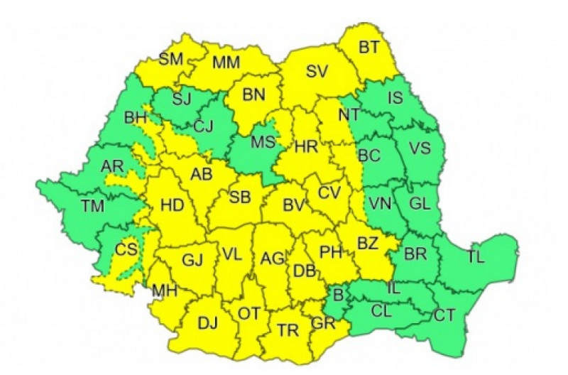 Meteorologii au emis un cod galben de ploi torențiale, vijelii și grindină, care va intra în vigoare joi la ora 12 și va afecta 31 de județe. Avertizarea va fi valabilă până joi seara, la ora 23:00.